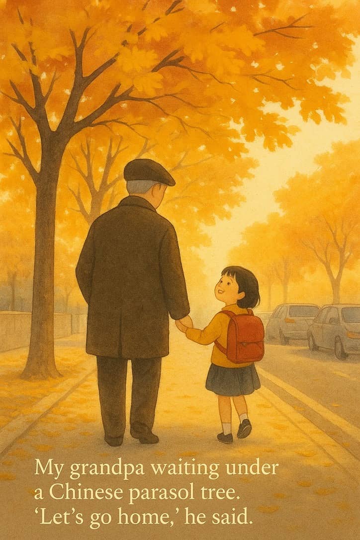 My grandpa, waiting for me under a Chinese parasol tree, just as the leaves turned orange—it must have been an autumn afternoon. I remember walking up to him with excitement, ready to tell him everything about school.